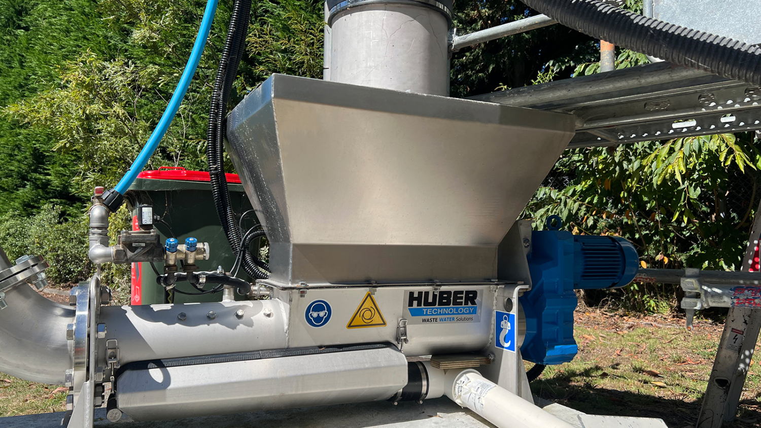 A HUBER WAP Wash Press was selected for the process and accepts screenings from current screening system onsite. The HUBER WAP is a horizontal screw wash press with discharge pressure pipe that is design to remove faecal material from captured screening and compact the screenings.